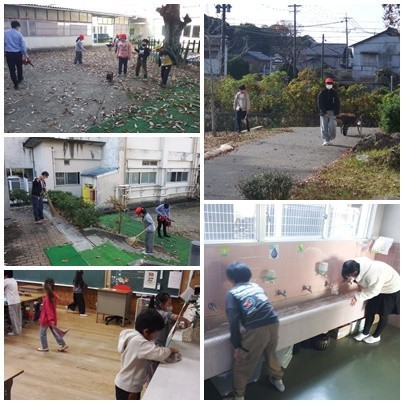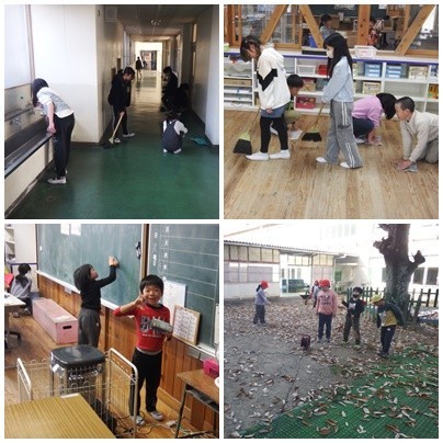 掃除の時間になりました。担当場所を一生懸命に掃除をしています。外は、木の葉がたくさん落ちる時期です。毎日落ち葉集めを頑張っています!