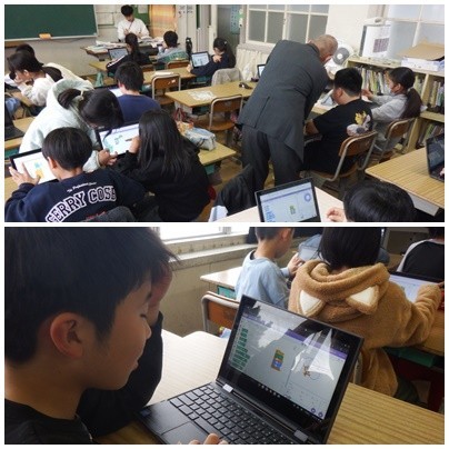 5年生 ラインズのICT授業です。タブレットをつかって、キャラクターを動かすプログラムを作りました。