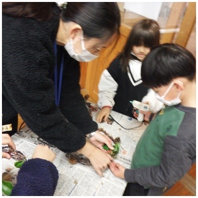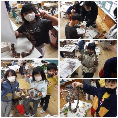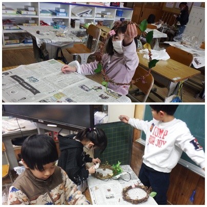 1年生 生活「クリスマスリース作り」育てたアサガオのつるをつかって、クリスマスリース作りを行いました。校庭で、木の実や色づいた葉を拾い、グルーガンを使って仕上げました。素敵なクリスマスリースが出来上がりました♪