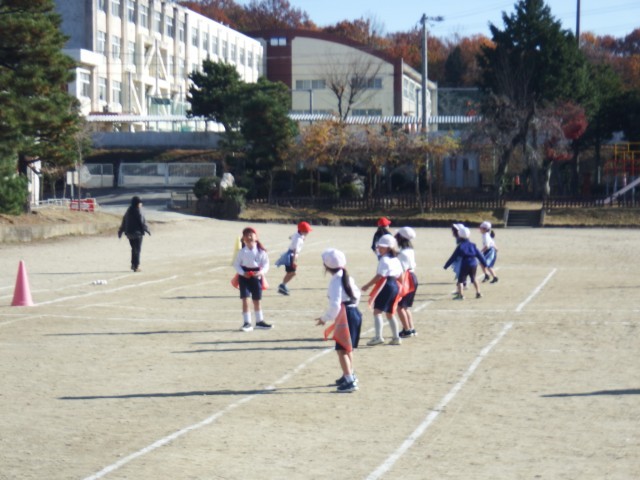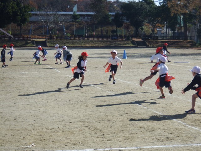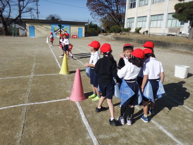 1年生 体育「鬼あそび」今日はぽかぽか陽気です。運動で体育を鬼遊びを行っています。ゲームを上手く進めるために、作戦会議をしながら取り組みました。