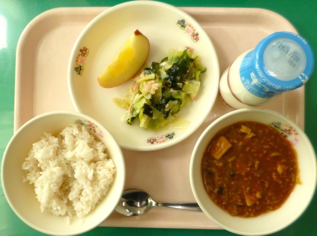 麦ご飯 牛乳 冬野菜のカレー ツナとわかめのサラダ りんご