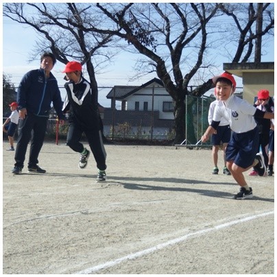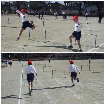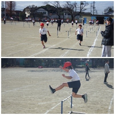 3年生 体育「ハードル走」運動場でハードル走に取り組みました。練習を積み上げて、計測を行いました。