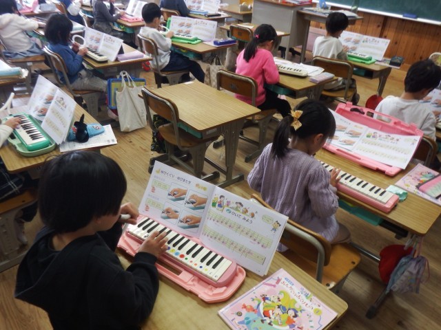 1年生 音楽「ひいてみよう」鍵盤ハーモニカをつかってすてきな音色を奏でました。今日は、ゆびくぐり、ゆびまたぎを練習しました♪