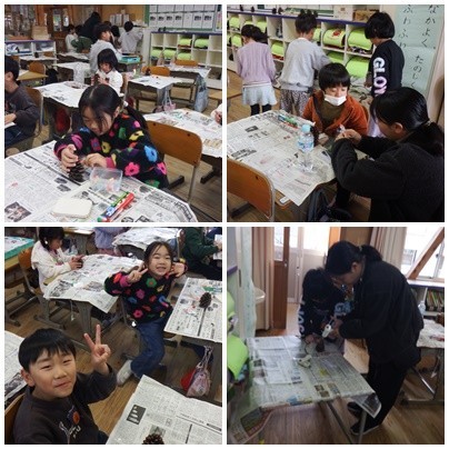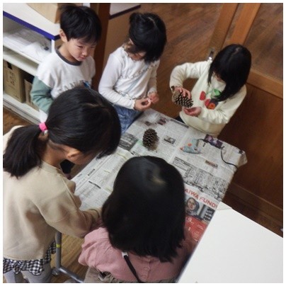 1年生 図画工作「クリスマスツリーづくり」自然にある松かさを活用して、松ぼっくりツリーを制作しています。