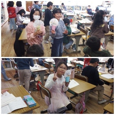 2年生 国語「紙コップ花火の作り方」おもちゃ作りの説明文を書きました。自分で使った紙コップ花火を見ながら、説明文を考えました。