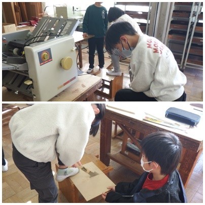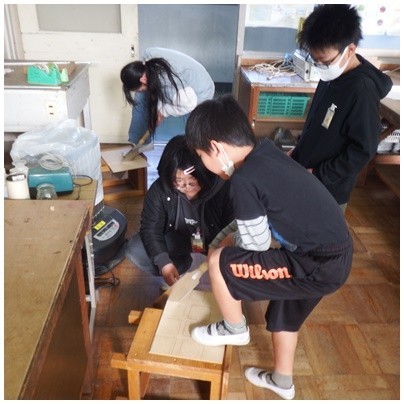6年生 図画工作「きって楽しいきっと使える」ノコギリなどを使って作品作りを行っています。安全にノコギリを扱う練習をしてます。