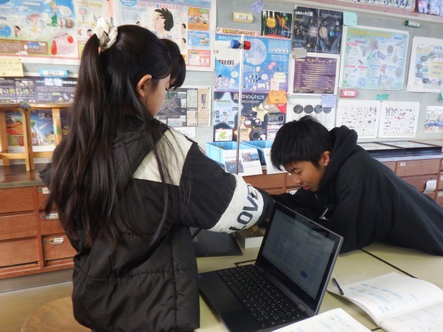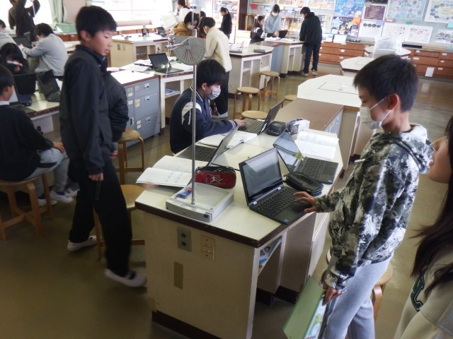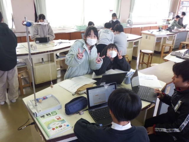 5年生 理科「ふりこのきまり」条件を変えながら、糸につるしたおもりが1往復する時間を調べて、タブレットにデータを入力しました。結果から分かることをノートにまとめました。