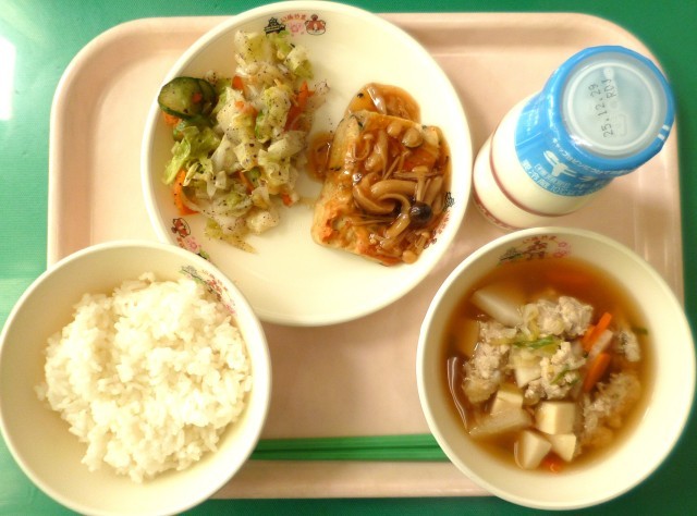 ご飯 牛乳 豆腐ステーキのきのこあんかけ ゆかり和え れんこんつくね汁