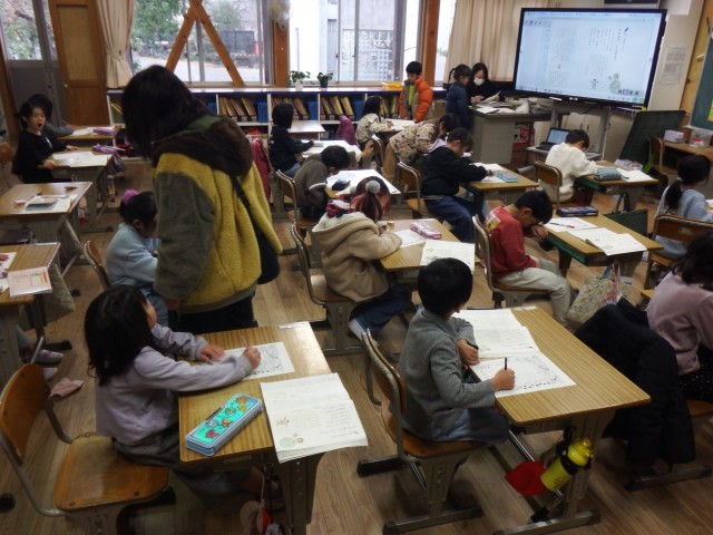 1年生 国語「てがみでしらせよう」学習発表会への招待状を書いています。今頑張っていることなどを文章に盛り込みながら。お家の人へ招待状を書いています。