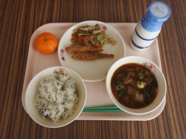 牛乳 あいちの大根葉ごはん めひかりのフライキャベツの朝しそあえ 愛知の味覚汁 みかん