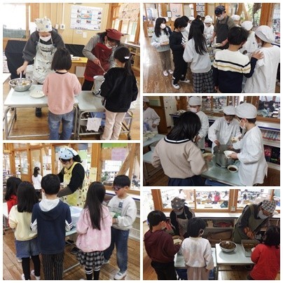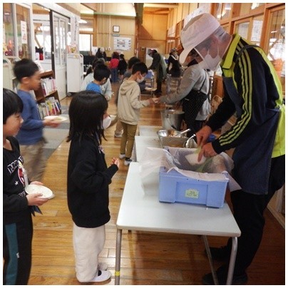 今日は、食育の日の献立です。温かい給食を味わって食べて堅田を温めましょう!「いただきます!!」
