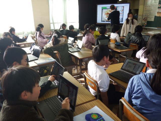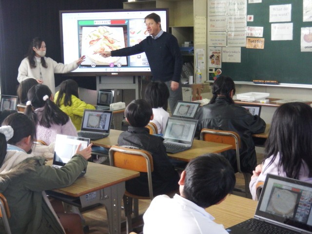4年生 外国語活動「Whaw do you want?」Whaw do you wantを言い合いながら、タブレットを使いながらお好みのピザを作りました。