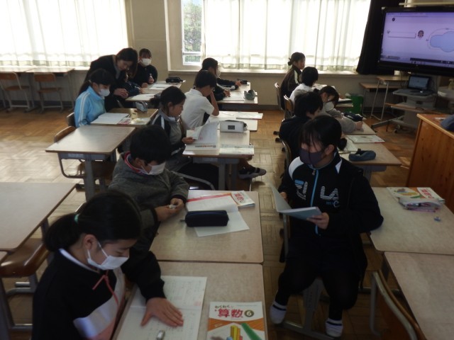 6年生 算数「およその形と大きさ」少人数授業の様子です。今日は、およその体積の求め方を考えました。練習問題を通して学びを深めることができました。