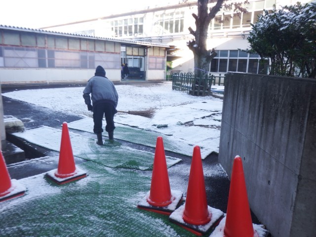 校内、児童が歩く道には、凍結を防ぐ目的で「にがり」を撒いています。運動場やゆめ広場、六角池周辺は雪が残っています。