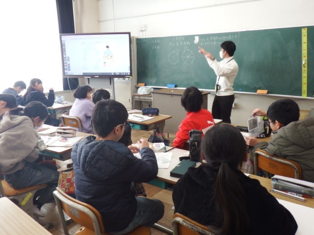 5年生 算数「円と正多角形」少人数授業の様子です。多角形の辺の長さや角の大きさについて調べました。