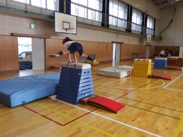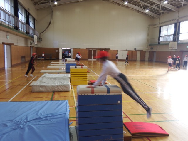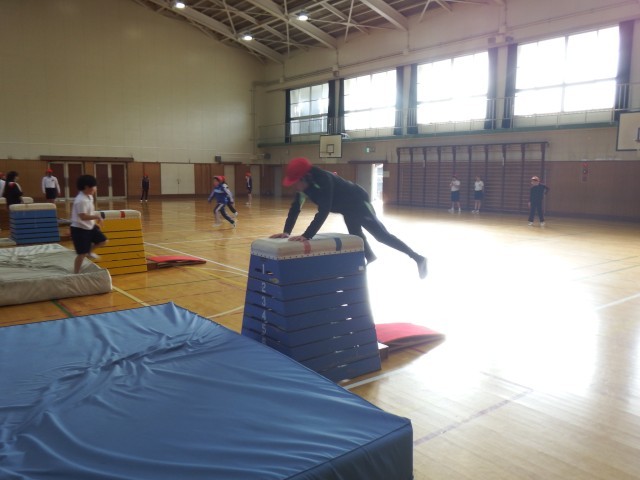 5年生 体育「跳び箱」体育館で跳び箱を行いました。助走の仕方、踏みきり、手をつく位置などの考えながら練習に取り組みました。