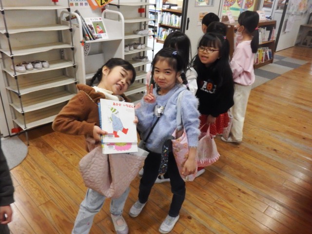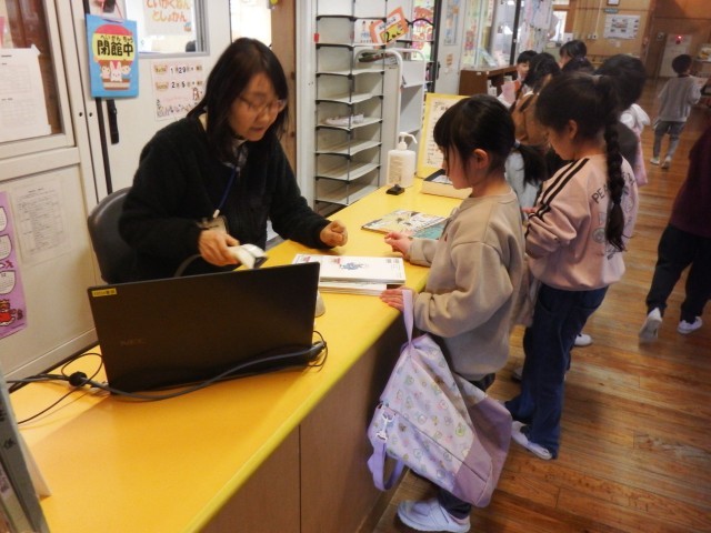 1年生 授業で使ったり、読書の時間に読んだりするために、頻繁に図書館を活用しています。今日は、どんな本を借りようかな!