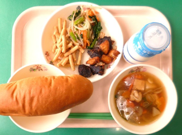 コッペパン 牛乳 くじらの竜田揚げ 小松菜のごま和え のっぺい汁 マカロニのきな粉まぶし