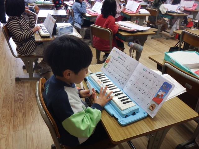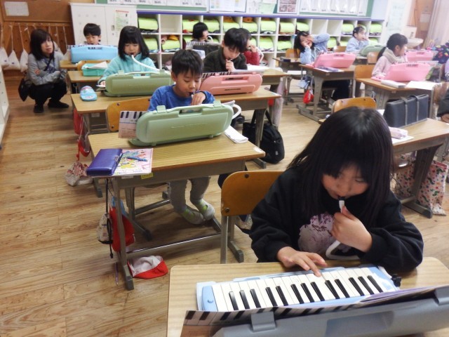 1年生 音楽「がっそうをしよう」今日は、せいじゃのこうしんの練習をしています。ゆび運びも上手になりましたね♪