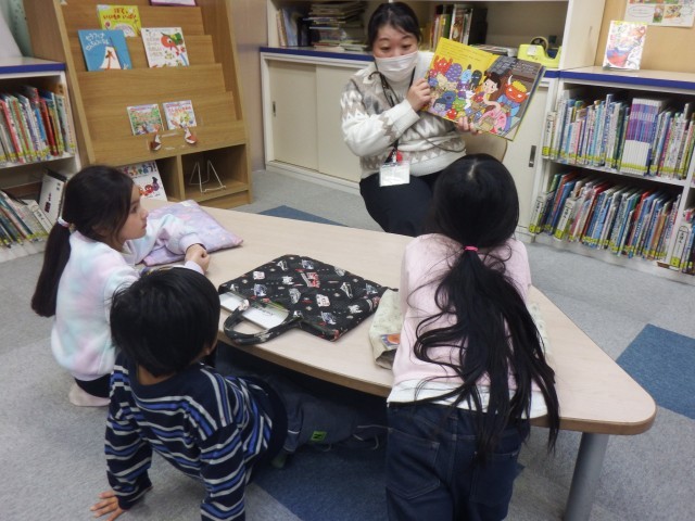 国語 低学年図書館で読み聞かせを行いました。図書館には魅力的な本がたくさん!担任の先生に絵本を読んでもらい、本の世界に浸りました。