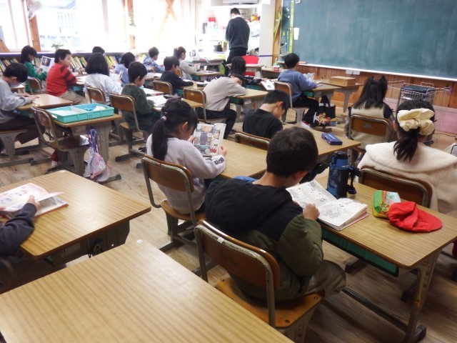 1年生 授業前の時間に、落ちついて読書活動をしています。今日はどんな本を読もうかな!落ち着いた時間を過ごしています。