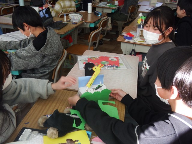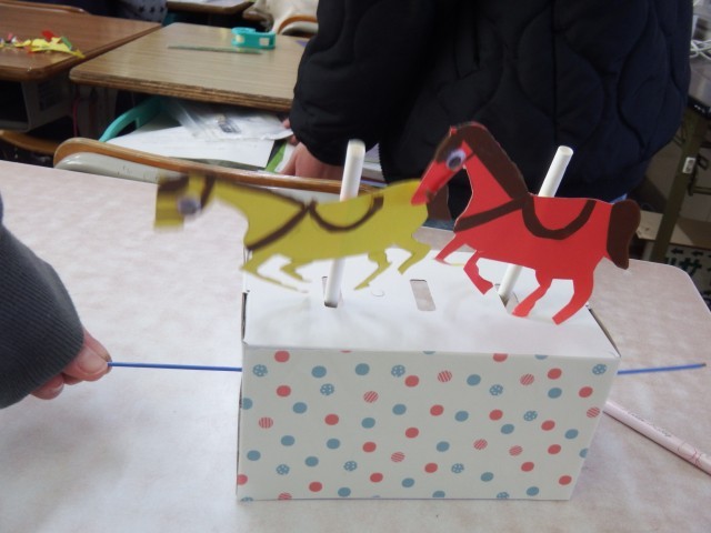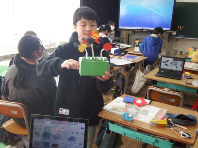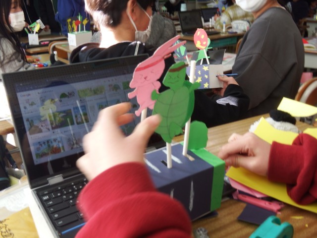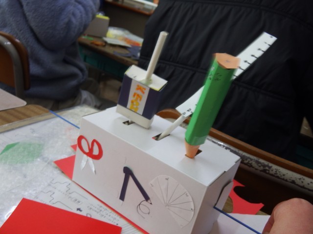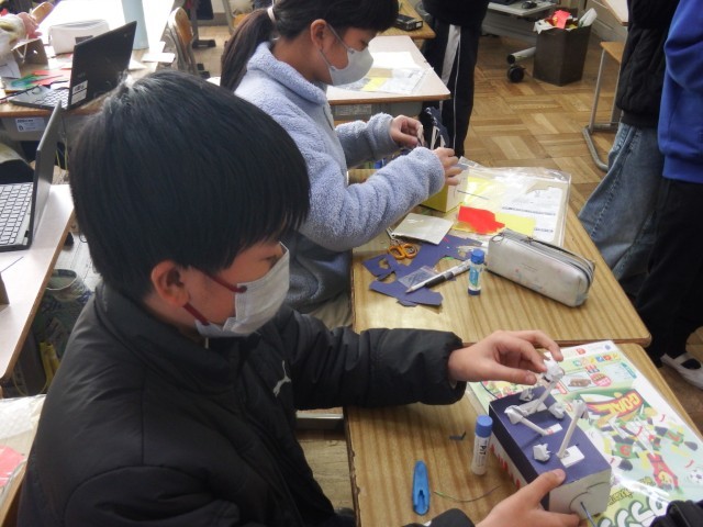 6年生 図画工作「くるくるクランク」作品が完成しました!クランクをまわすとキャラクターが踊ります。おもしろかわいい動きが楽しいですね!個性豊かな作品に仕上がりました♪