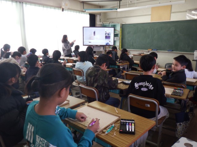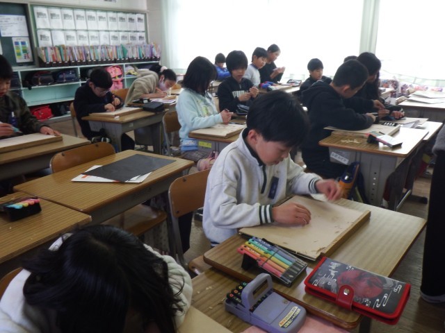 4年生 図画工作「ほってすってみつけて」彫刻刀を扱い始めました。正しく安全に使うことができるように練習しました。