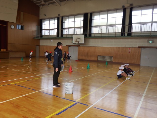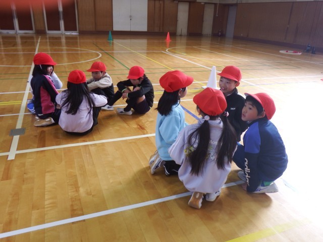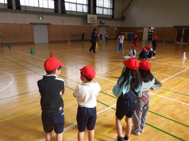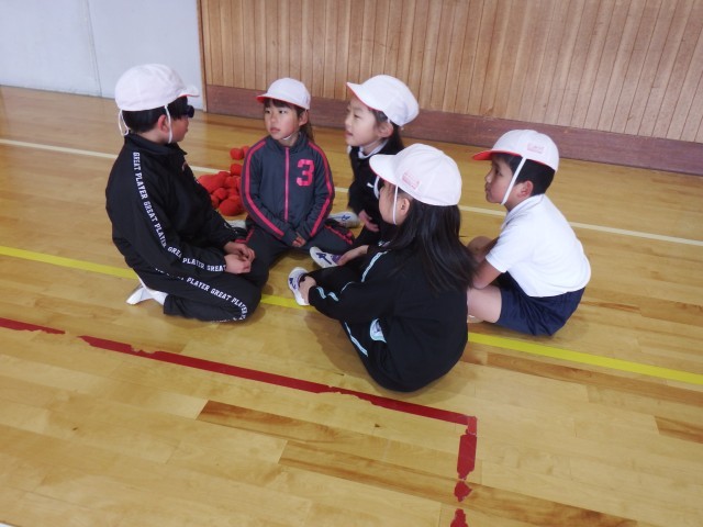 2年生 体育「ボール運びゲーム」体育館でボール運びを行いました。チームで参戦を立ててゲームを行いました。作戦会議も頑張りましたね!