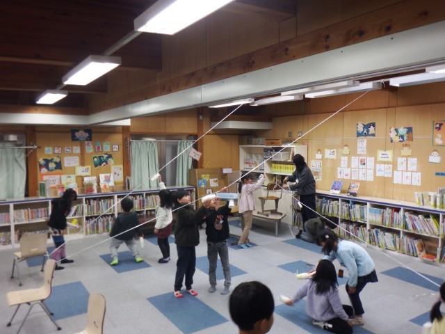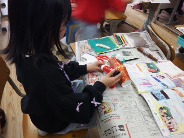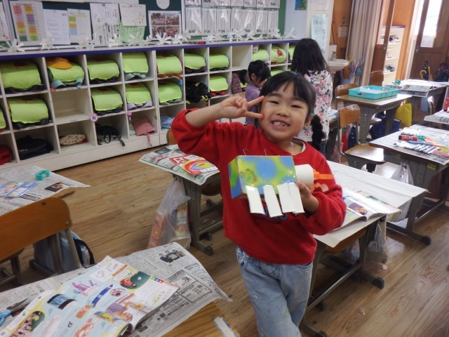 1年生 図画工作「スルスルビューン」するする動くように工夫をしました。かわいらしいデザインがほどこされたロケットが飛び回りました♪