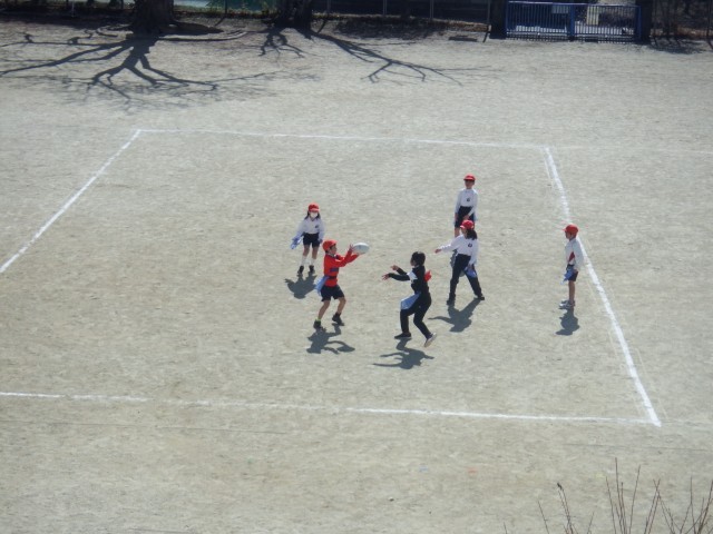 3年生 体育「タグラグビー」運動場でゲームを行いました。チームで参戦を考え、広いコートを走りまわりました!