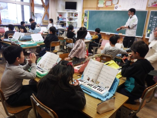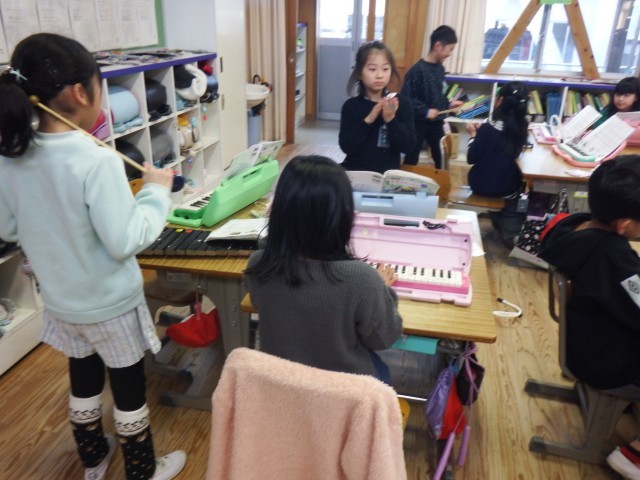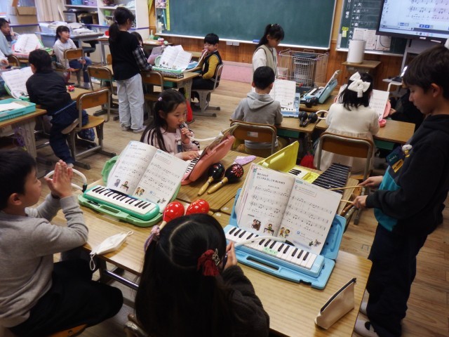 2年生 音楽「合奏 チャチャマンボ」音をえらんで級友を合奏を楽しみました。リズムよく楽器を奏でることができましたね♪