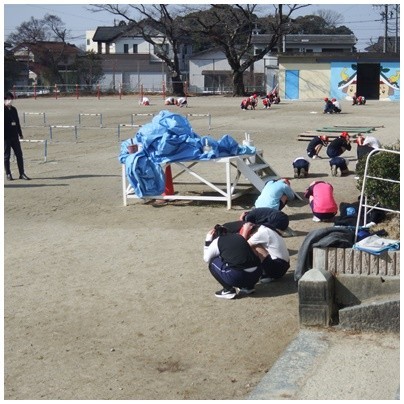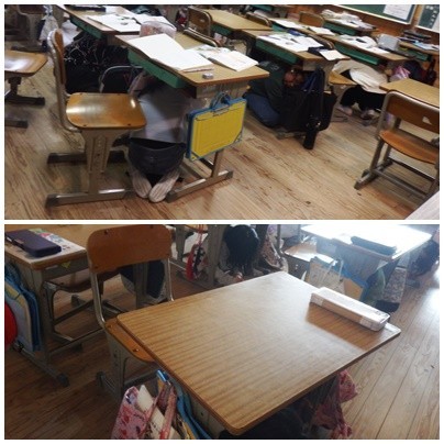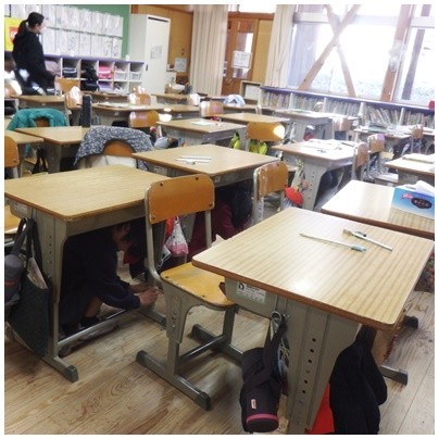 訓練用の緊急地震速報が響くと、児童は自然とシェイクアウトの姿勢がとれるようになっています。身を守るための安全確保行動が身についてきています!