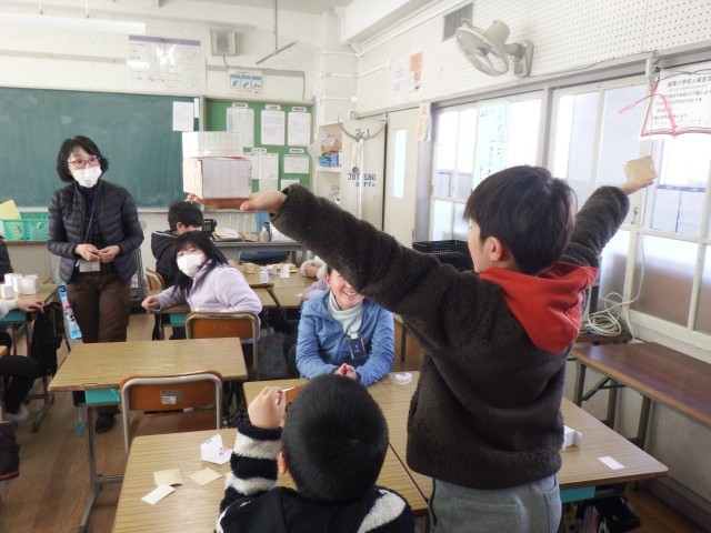 4年生 算数「直方体と立方体」形の違いに着目して、立体の分類を行いました。どこがどのように違うのかなど伝え合いました。