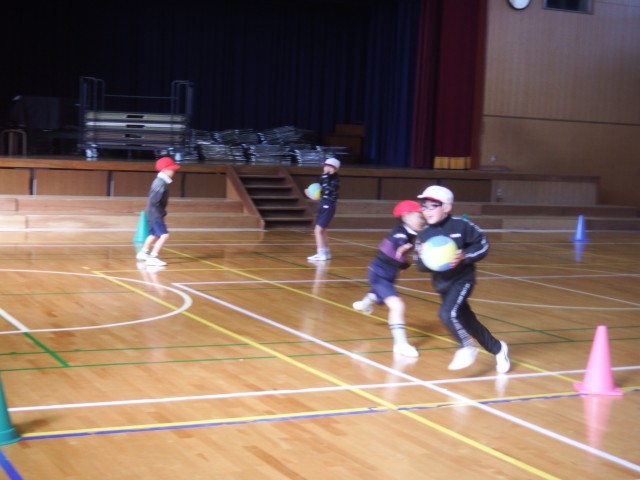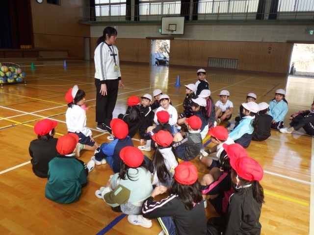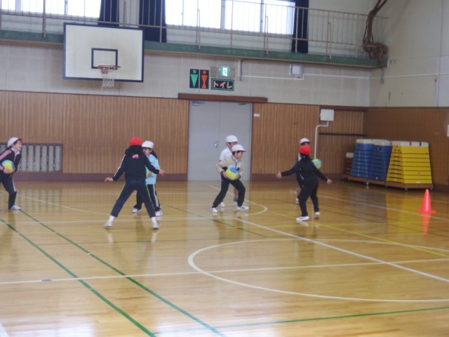 2年生 体育「ボール運びゲーム」体育館で活動しました。チームで作戦を考えて、チームワークを活かし、ボールをゴールへ運ぶことができました。