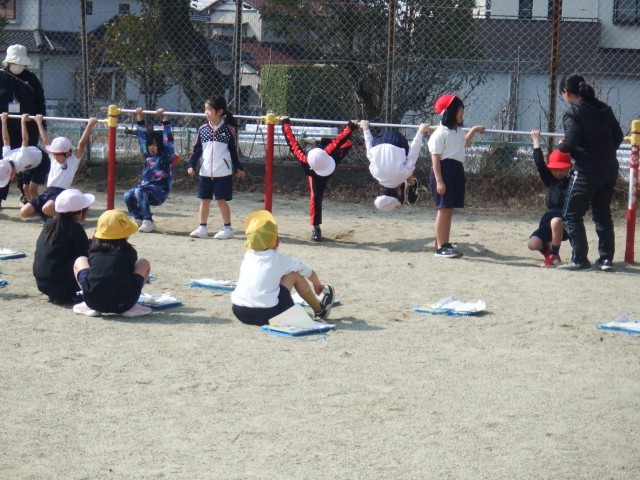1年生 体育「鉄棒」今日は、運動場で鉄棒に挑戦しました。いろいろな技を練習していきました!なんども練習していこうね♪
