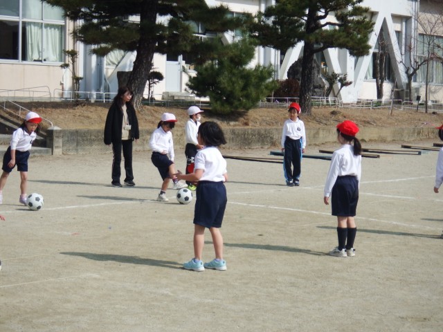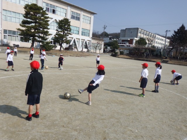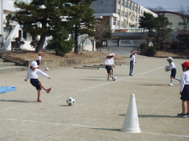 1年生 体育「ボール蹴りゲーム」サッカーを扱います。狙ったところに蹴る!ボールを止める。などの技術練習を行いました!