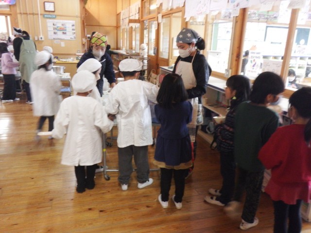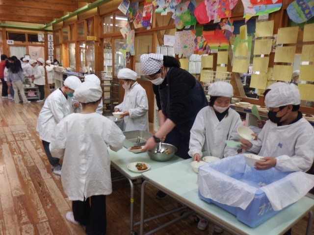 給食の時間になりました。みなで協力して準備を進めています!今日もしっかり食べましょうね!!