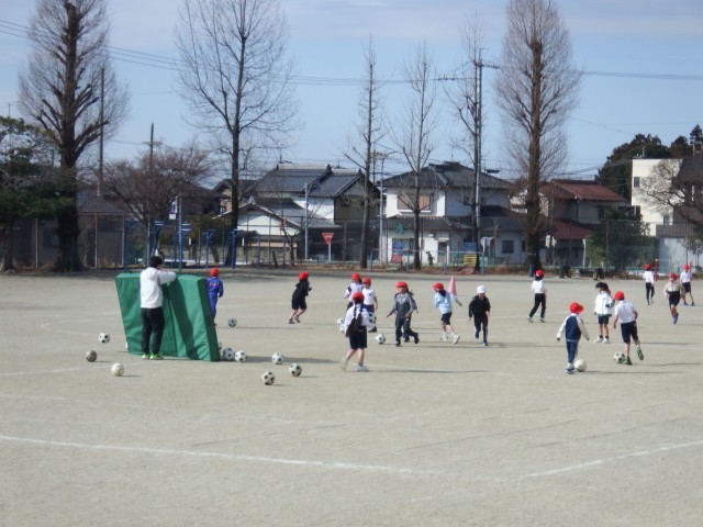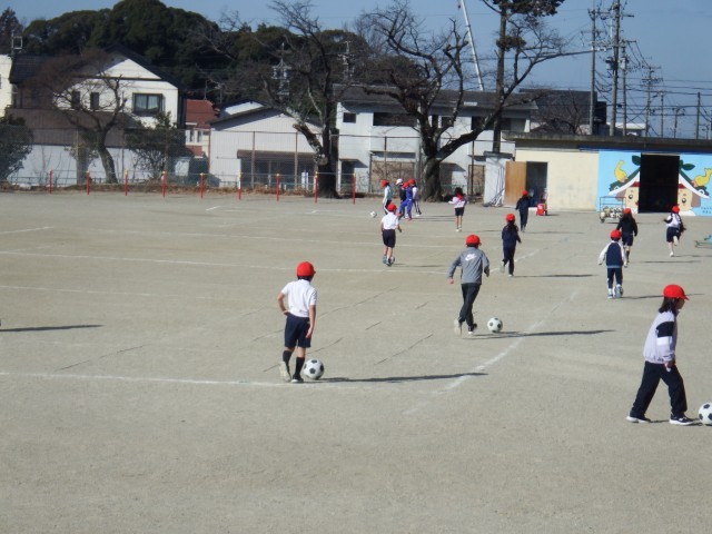 2年生 体育「ボール蹴りゲーム」サッカーボールを蹴る練習をしています。仲間に向けてボールを蹴る、ドリブルをする、ゴールにむけてボールを蹴るなど技術練習を行いました!