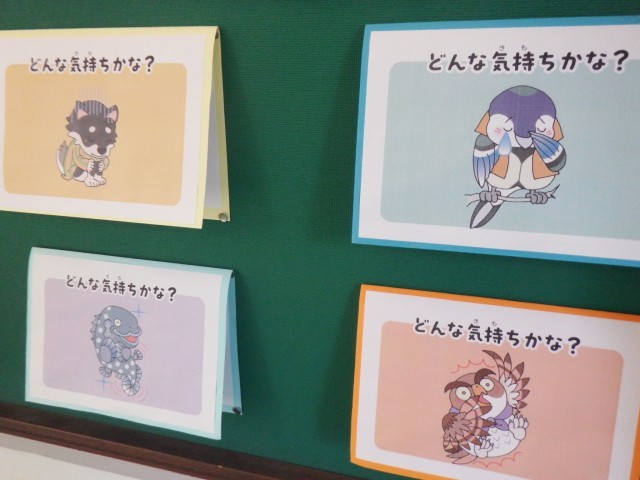 保健室「いろいろな気持ちを知ろう!!」保健室前の掲示が新しく変わりました。心キャラクター図鑑を見てみよう!キャラクターの表情からどんな気持ちか当ててみよう!保健室前の掲示板をのぞいてみましょう。