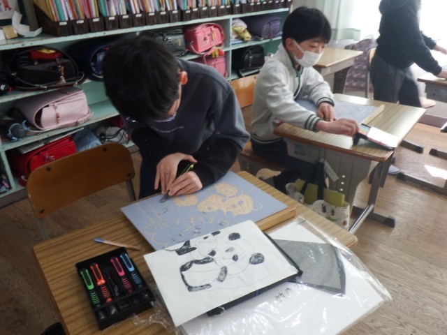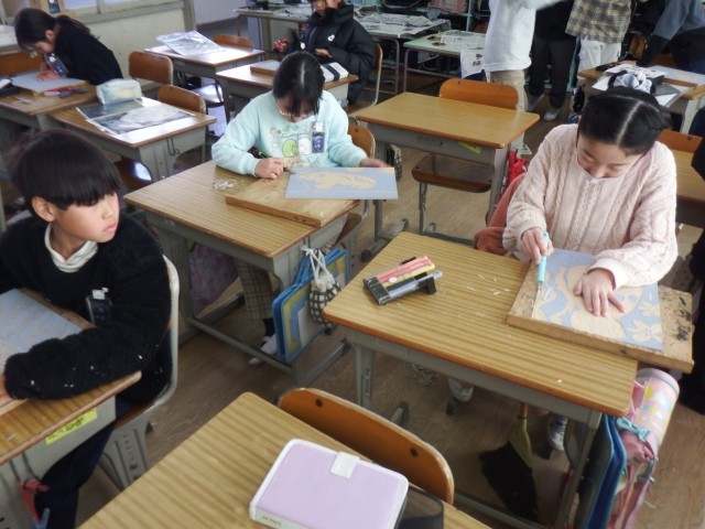 4年生 図画工作「ほってすってみつけて」彫刻刀を安全に使って制作をしています。いよいよインクをつけて印刷をしていきます!