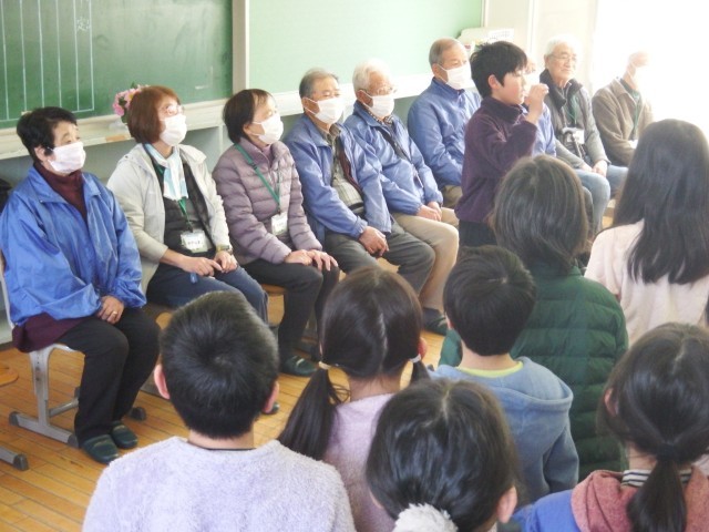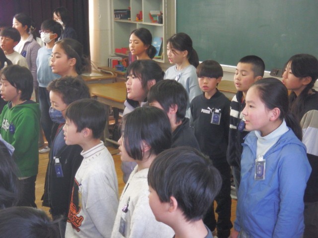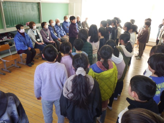 4年生 里山学習感謝会 学習会の終わりに、感謝の気持ちを込めて「ふるさと」を合唱しました。「山も風も海の色も 君のふるさと 僕のふるさと ここはふるさと」ご来校いただいた皆さま、今日はありがとうございました。(城東の里運営協議会 地域学校協働活動)