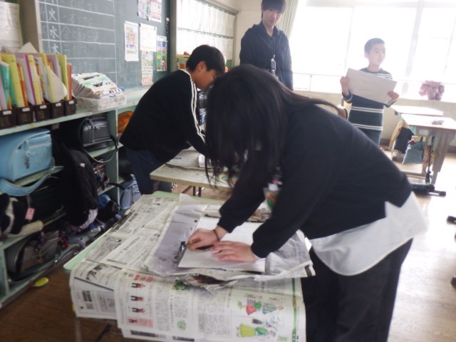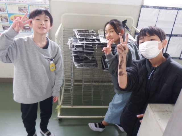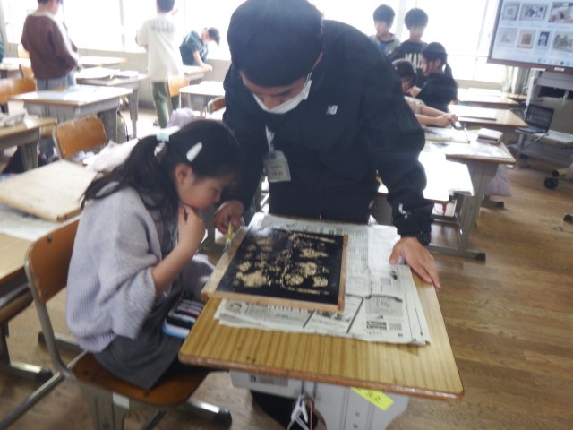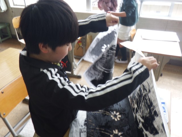 4年生 図画工作「ほってすってみつけて」今日は、インクをつけて印刷を行いました。思い通りの作品に仕上がったかな!?