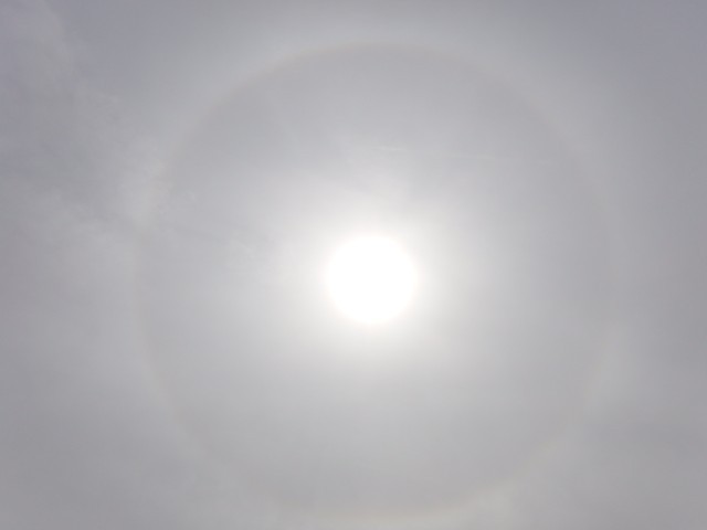 太陽のまわりに虹色の輪ができています。ハロですね!これは天気が下り坂のサインです。明日は雨降りかな!?