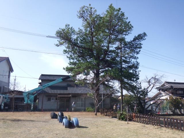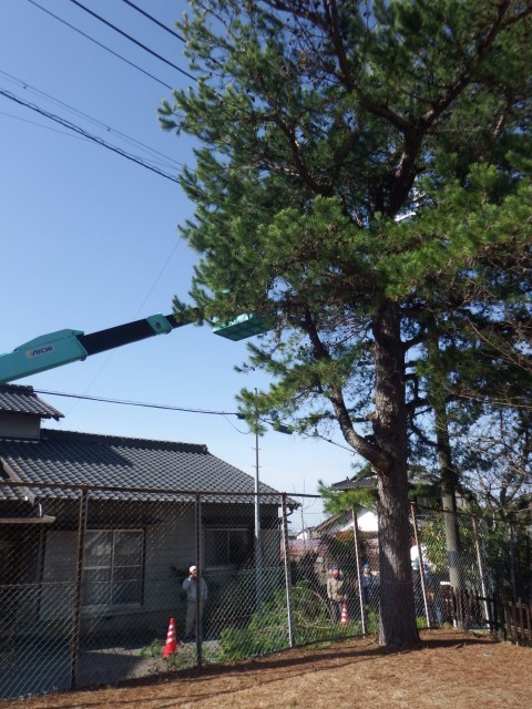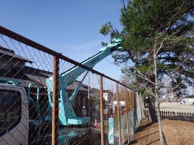校庭に木々の枝打ち、剪定を行います。高所作業車で作業を行っています。