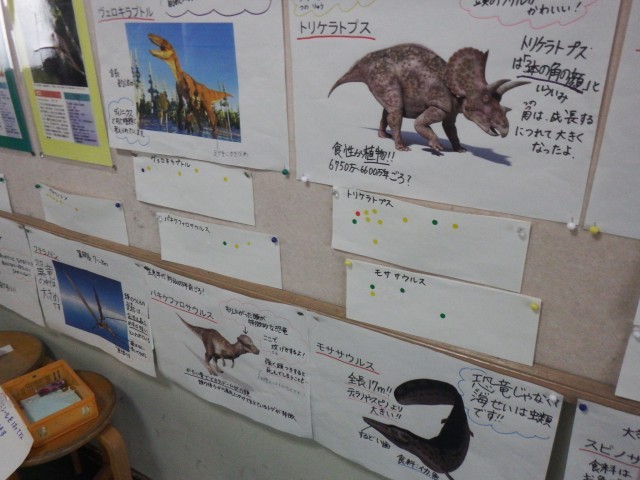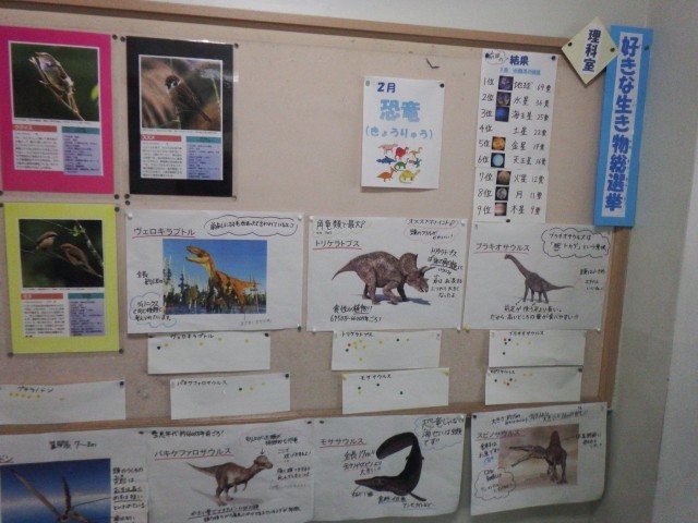 理科室前の掲示板にも情報がたくさん!ただ今、好きな生き物総選挙「2月恐竜編」を開催中です♪あなたも好きな恐竜に1票入れてみませんか!?