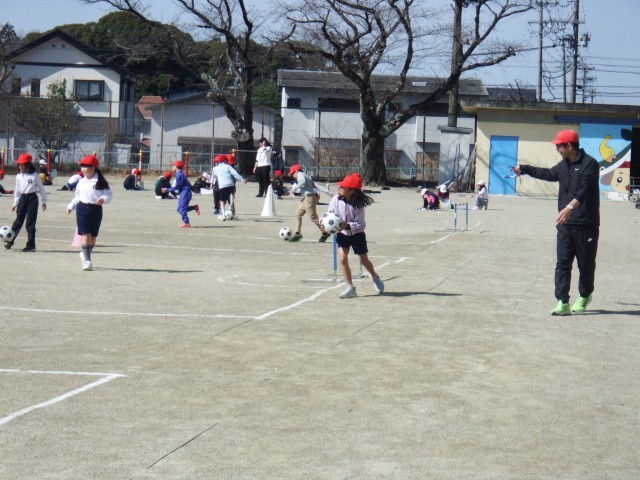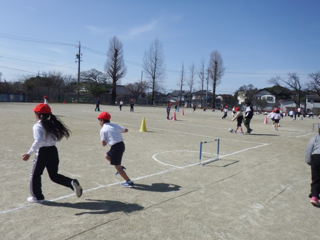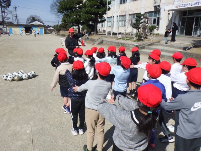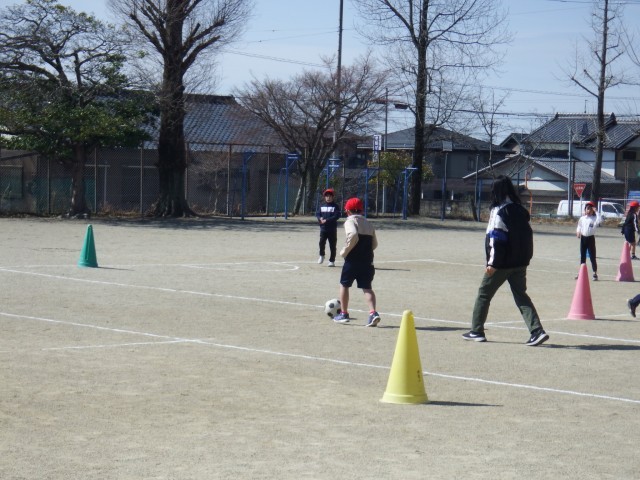 2年生 体育「サッカー」運動場で活動しました。準備運動をしっかりした後、サッカーに取り組みました。ボールの扱い方を練習しましたね♪