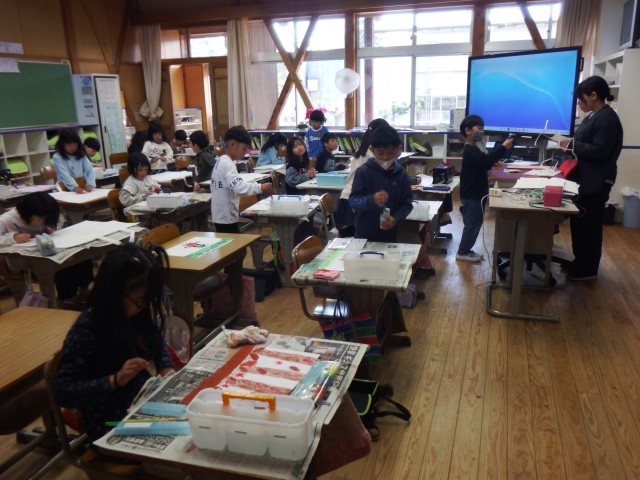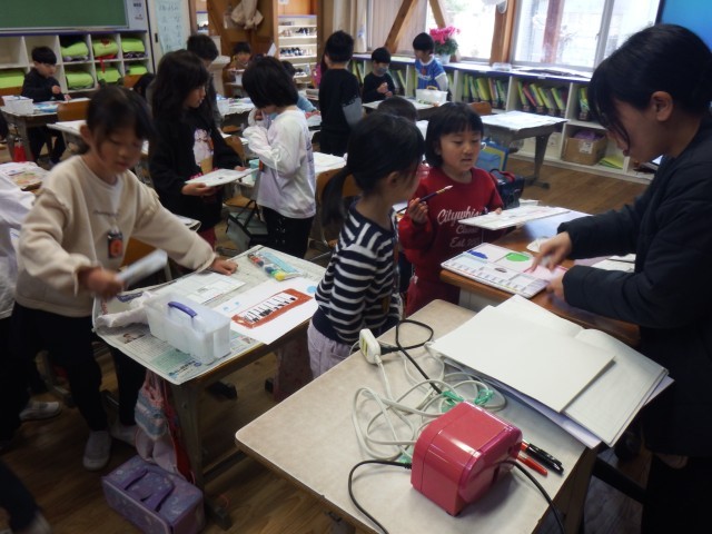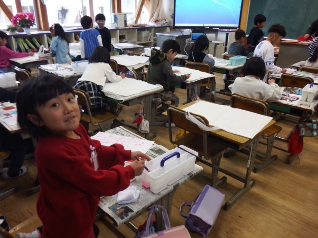 1年生 図画工作「1年生おもいでのえ」作品が完成しました。今日は、作品持ち帰りバックに絵を描きました。