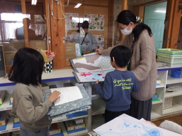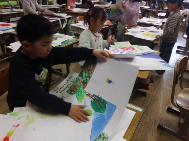 1年生 図画工作  年度末が迫ってきました。後期の作品を整理しています。持ち帰りバックに入れてお家に持って帰りましょうね!
