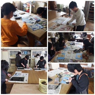 5年生 図画工作「らくらくカラー版画」作品作りを行っています。彫刻とで版を削り、印刷を行いました。