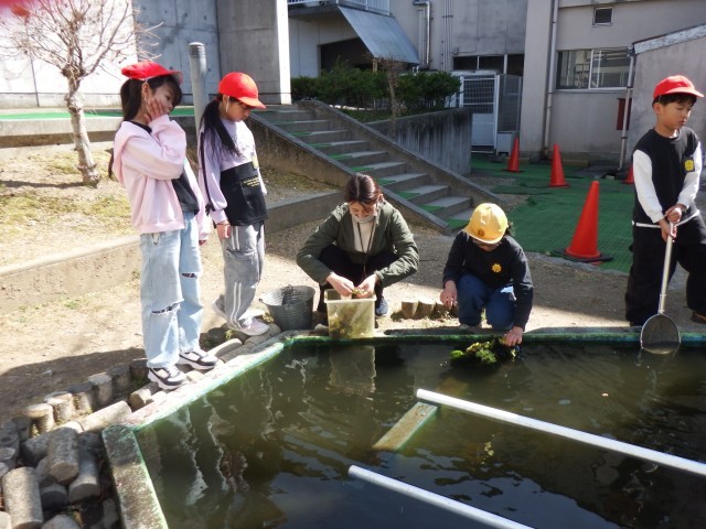 理科室で越冬に成功した布袋葵を池に浮かべました。立派に成長をしてほしいですね!